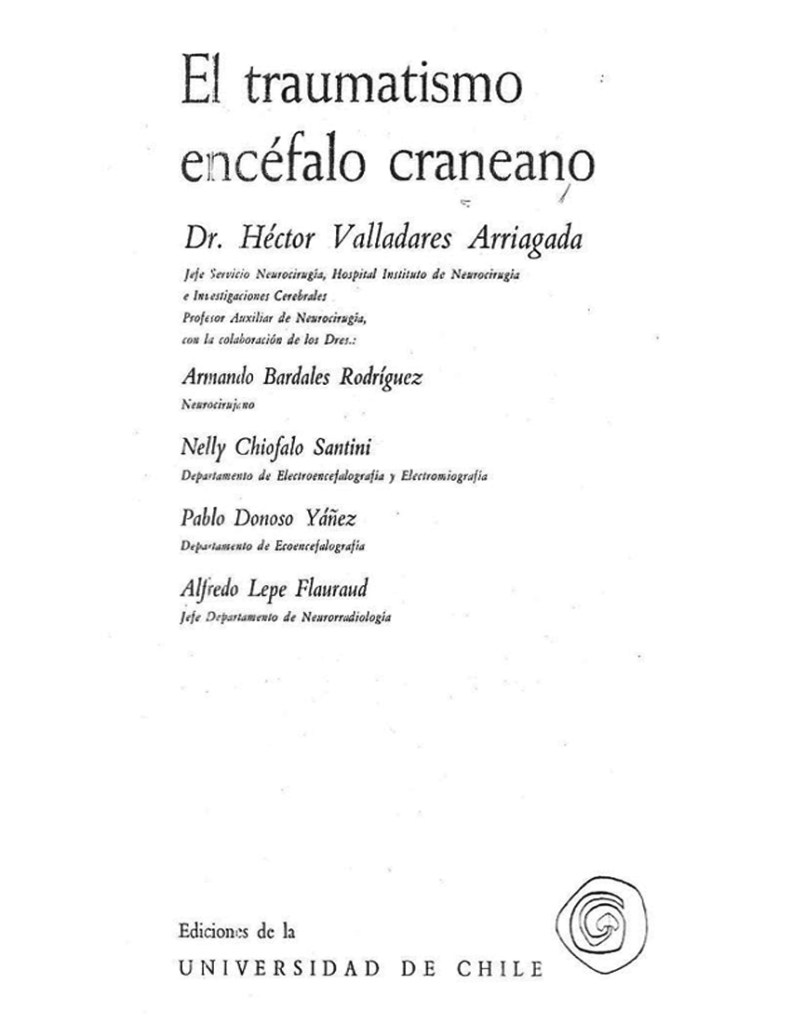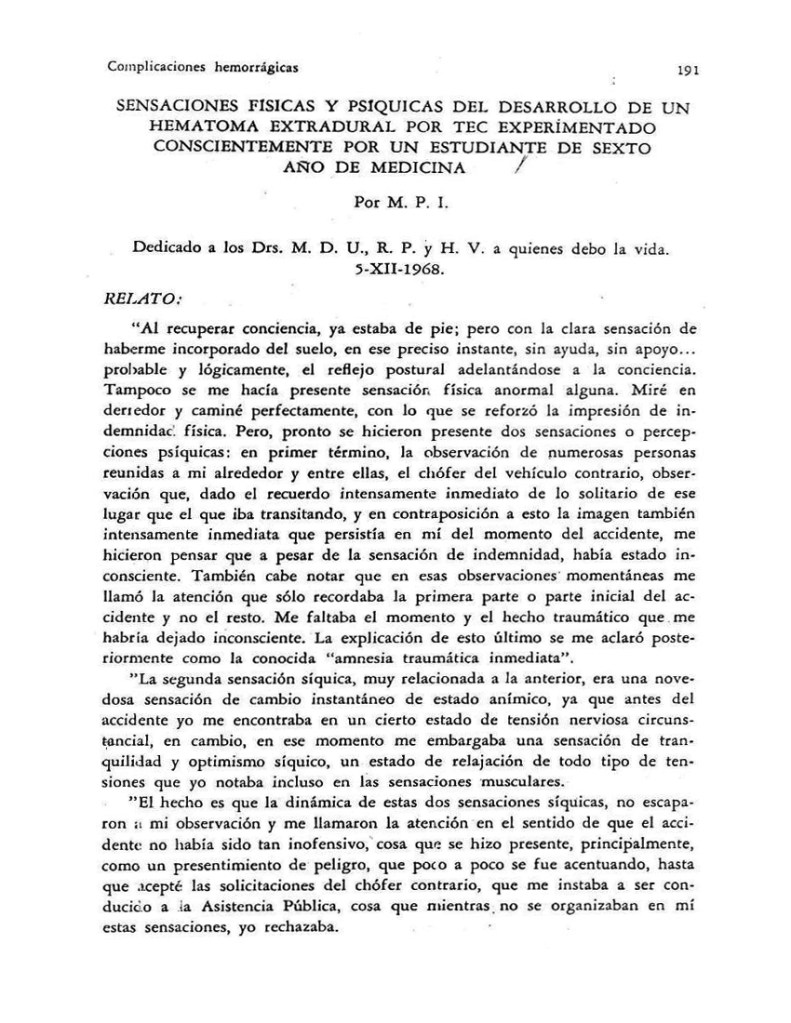 -. Autor de la primera descripción del desarrollo de un hematoma extra-dural, por TEC, experimentado conscientemente (a raíz de accidente en motoneta) como estudiante de 5° año de Medicina (publicado “in extenso”, en el libro “Traumatismo encéfalo craneano” del Profesor de Neurocirugía Héctor Valladares Arriagada) (1968): “Sensaciones Físicas y Psíquicas del Desarrollo de un Hematoma Extra-dural por TEC Experimentado Conscientemente por un Estudiante de 5° año de Medicina”. Que constituyó una contribución al cuadro clínico y diagnóstico del TEC complicado, y fue presentado en el Congreso Panamericano de Neurocirugía en Chile, coincidentemente el año 1968.