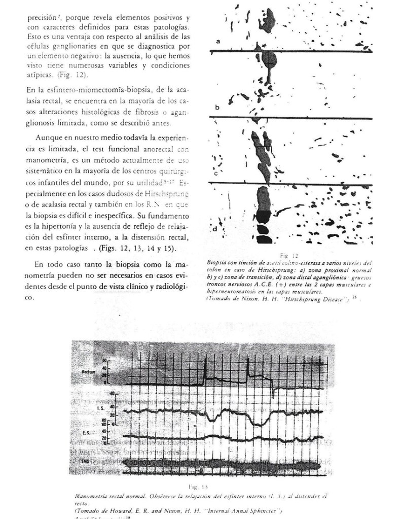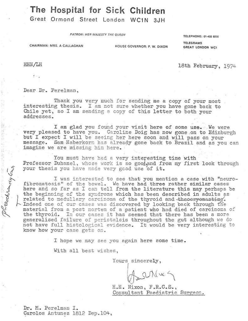 21.2) Asistencia al Servicio de cirugía Infantil del Dr. H.H. Nixon, en el “Hospital for Sick Children” de Londres (1 mes). Con curso de “manometría rectal” (Dr. Samuel Habercorn) y “biopsia de mucosa por succión” y “tinción de acetil-colino –esterasa”. Elementos de diagnóstico en la enfermedad de Hirschsprung y acalasia rectal, que presenté, desarrollé y difundí en nuestro medio especializado, y actualmente de uso generalizado.