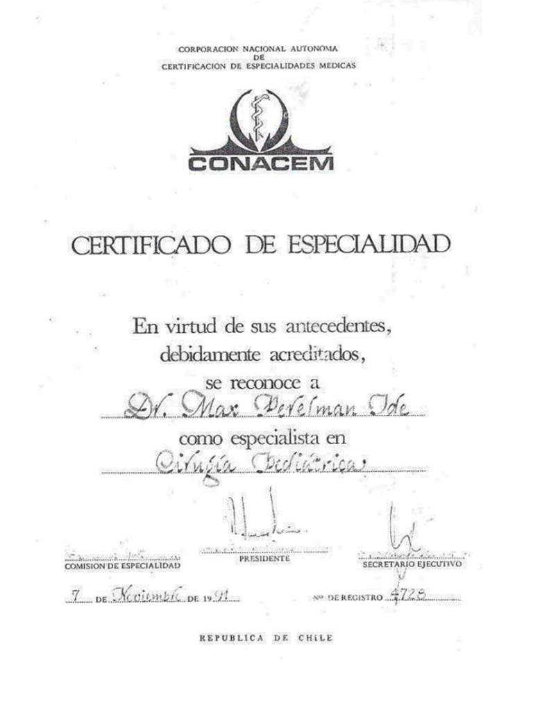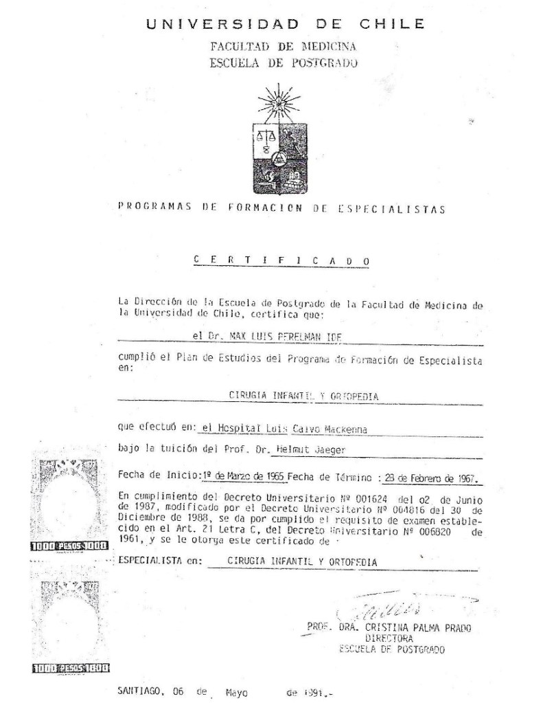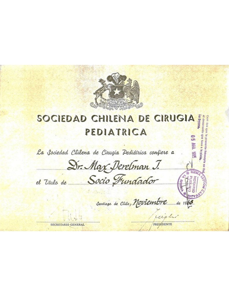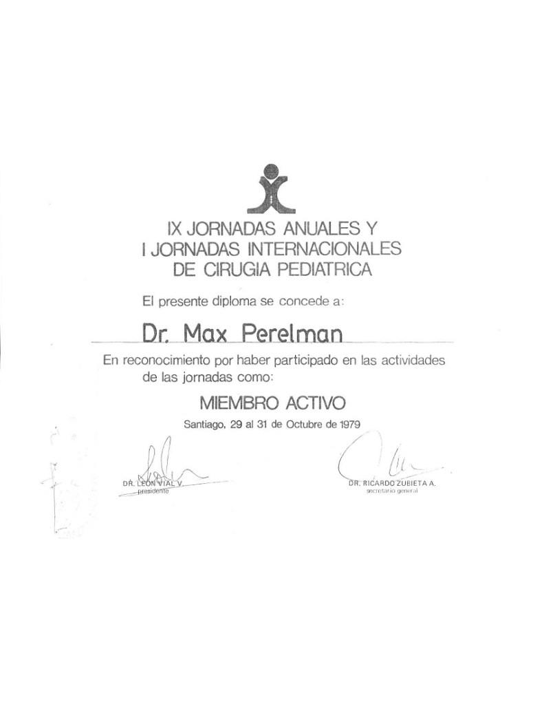 Médico Cirujano Infantil Especialista, miembro de “Conacem”. “Asistente extranjero” de la facultad de Medicina de la Universidad de Paris. Socio activo fundador de la Sociedad Chilena de Cirugía infantil. Socio activo de la Sociedad Chilena de Pediatría. Socio de la Sociedad de Pediatría de la 4ª Región. Socio de la Sociedad Panamericana de Cirugía Pediátrica. Iniciador, introductor, pionero de nuevas técnicas quirúrgicas y diagnósticas en Patologías Congénitas Infantiles colo-recto–perineales, que hoy se aplican de rutina en la Cirugía Infantil en Chile.